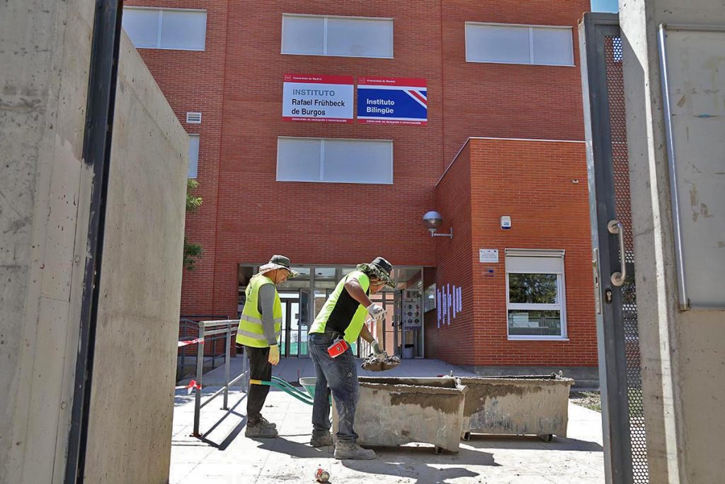 En el caso del IES Rafael Frühbeck de Burgos, en Leganés, alumnado y profesorado entraban y salían del centro mientras dos trabajadores terminaban a contrarreloj las obras en el suelo en la misma entrada del instituto, aparte del andamiaje que seguía cubriendo buena parte de sus instalaciones.
