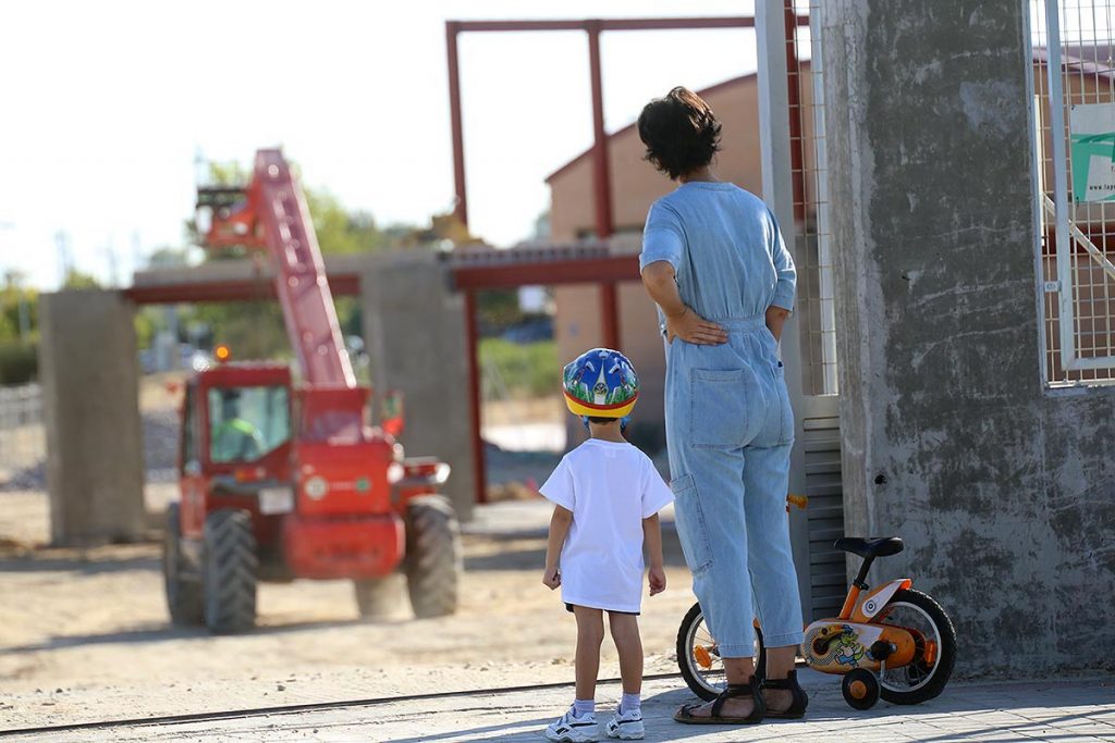 Una madre y un niño observan las obras en el CEIP Antonio Fontán, en Montecarmelo, en Madrid
