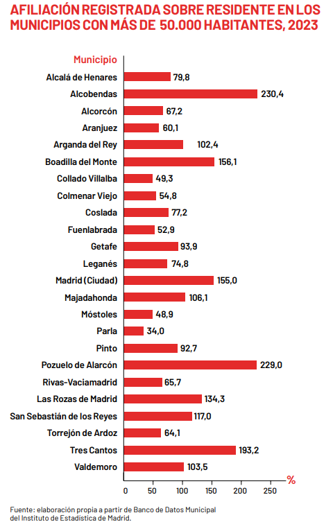 Al mismo tiempo, el importante incremento de los precios de la vivienda sigue desplazando a más personas a destinos alejados de sus centros de trabajo, consolidando una profunda división entre municipios mayoritariamente residenciales, con peores perspectivas de empleo, y otros que concentran la mayor parte de la actividad económica y productiva de la Comunidad de Madrid. Al cierre de 2023, de los 24 municipios de más de 50.000 habitantes, 10 tienen una afiliación registrada mayor de los que residen en sus localidades. Entre ellos, destaca la Ciudad de Madrid, que por sí sola representa más del 70% de la población trabajadora total de la Comunidad. En el otro extremo, encontramos a Parla, donde las personas cuyos centros de trabajo radican en el municipio representan apenas un tercio de la población trabajadora residente (véaseTabla 1).