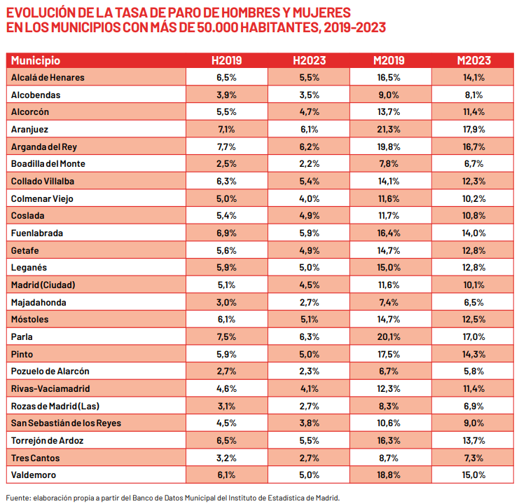 En lo sociolaboral, la desigualdad en la distribución del empleo se reproduce en las diferencias en el nivel de desempleo. Al cierre de 2019 había 353.737 personas registradas como paradas en la Comunidad de Madrid (un 9,6% de la población activa), que en 2023 se habían reducido hasta los 314.982 (un 8,2% de la población activa). Pero mientras municipios como Alcalá de Henares, Aranjuez o Parla cerraron 2023 con más del 10% de paro registrado entre su población residente, municipios como Boadilla del Monte o Majadahonda tenían tasas inferiores al 5%.