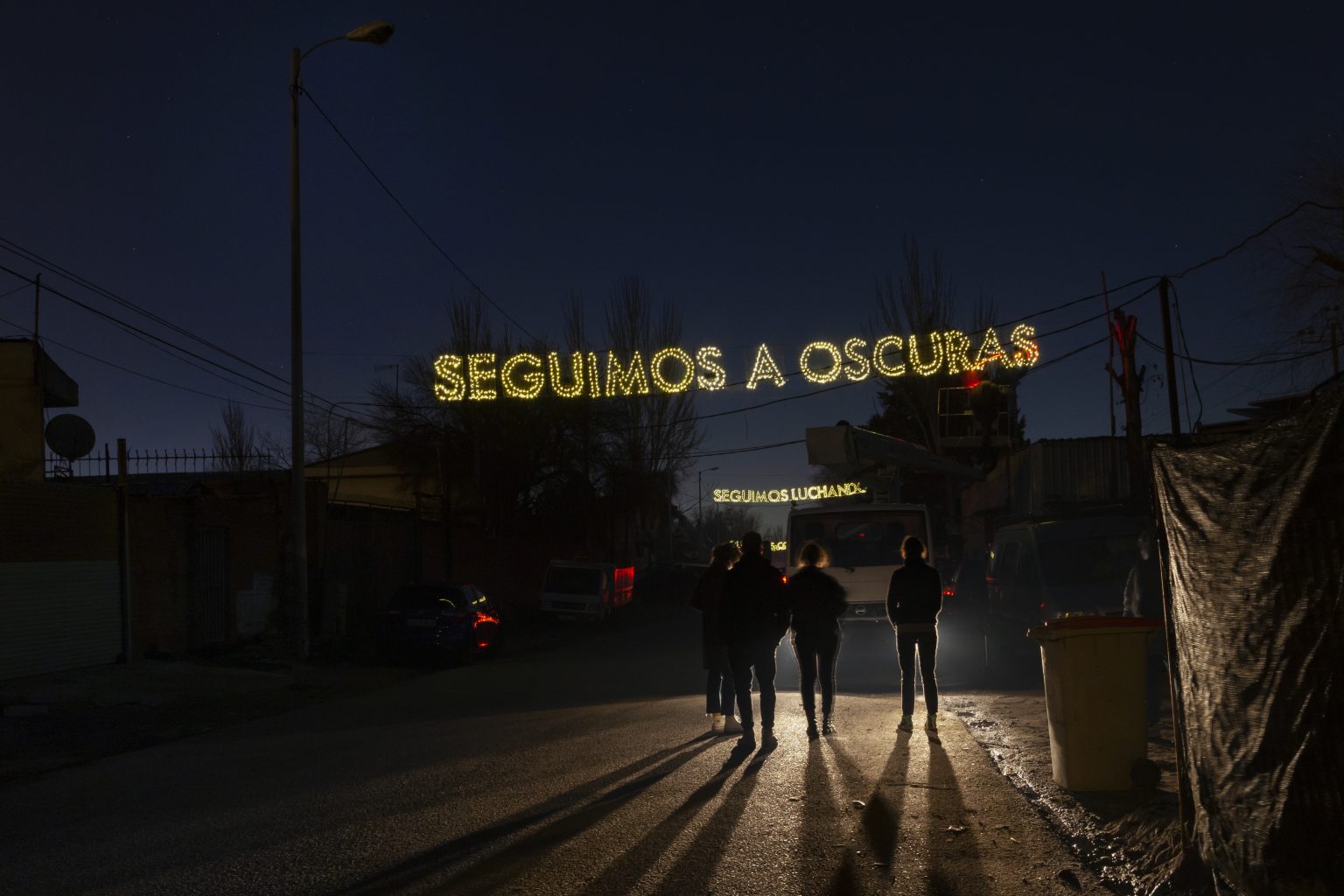 Vamos a empezar por lo cercano. En Madrid Boa Mistura (“buena mezcla” en portugués) quiso comprometerse con los vecinos de la Cañada Real Galiana, sin contratos de luz desde hace cuatro años. “Seguimos luchando” es una instalación de cuatro guirnaldas de luz alimentadas por energía solar cuya consigna, “SEGUIMOS A OSCURAS/SEGUIMOS LUCHANDO/QUEREMOS CONTRATOS/LUZ PARA CAÑADA”, reclama la formalización de contratos con las eléctricas para que la luz vuelva a la Cañada de una vez por todas.
