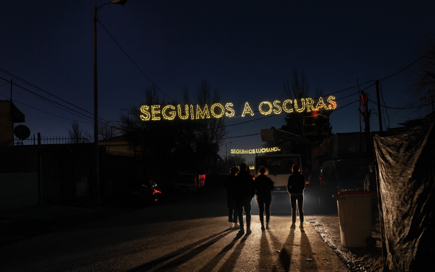 Vamos a empezar por lo cercano. En Madrid Boa Mistura (“buena mezcla” en portugués) quiso comprometerse con los vecinos de la Cañada Real Galiana, sin contratos de luz desde hace cuatro años. “Seguimos luchando” es una instalación de cuatro guirnaldas de luz alimentadas por energía solar cuya consigna, “SEGUIMOS A OSCURAS/SEGUIMOS LUCHANDO/QUEREMOS CONTRATOS/LUZ PARA CAÑADA”, reclama la formalización de contratos con las eléctricas para que la luz vuelva a la Cañada de una vez por todas.